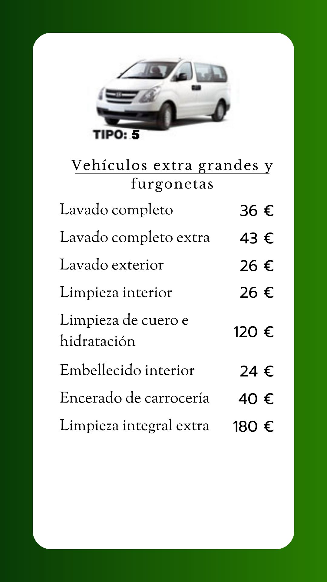 Lavado exterior, aspirado de moquetas, asientos y ceniceros, limpieza de cercos de puertas, limpieza de cristales y perfumado interior. Tiempo: 1 hora